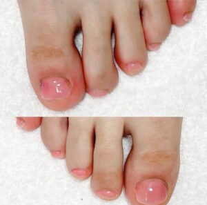 足の場合もジェルやスカルプなどを使用して深爪のケアを行いますが、足の爪はやり方によっては巻き爪を誘発してしまう場合もあるので、より慎重に進めて行きます。